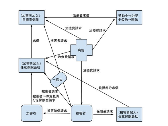健康保険・労災保険・自由診療です。交通事故で治療を受ける場合には、通勤中の事故なら労災保険を、それ以外の場合には、健康保険を使うべきです。